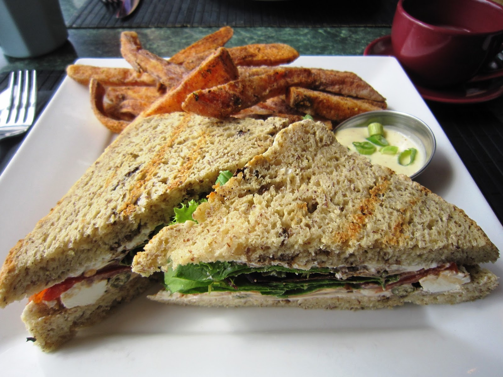 On this particular day I went out for lunch with my boss. On my plate was a roasted red pepper & goat cheese sandwich on GF bread with a side of the best ever sweet potato fries!